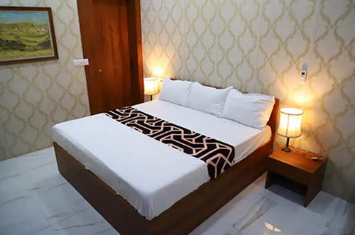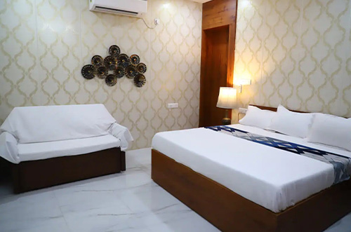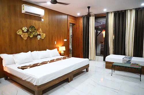 Four spacious bedrooms, each with king-sized beds, air-conditioning, & attached bathrooms equipped with modern fixtures.