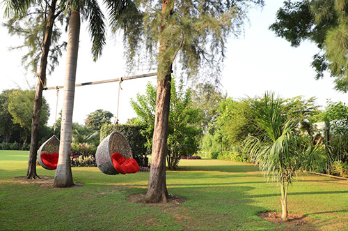 Comfortable outdoor seating areas and hanging swings offer perfect spots for enjoying the farm’s scenic beauty.